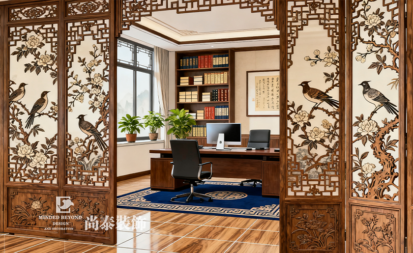国风办公室装修需兼顾 “文化底蕴与功能实用”,尚泰装饰擅长将传统元素现代化。其经典方案为:墙面局部采用中式屏风(可定制公司文化图案),其余区域刷朱砂红或墨黑乳胶漆,地面铺仿木纹瓷砖,搭配中式地毯。