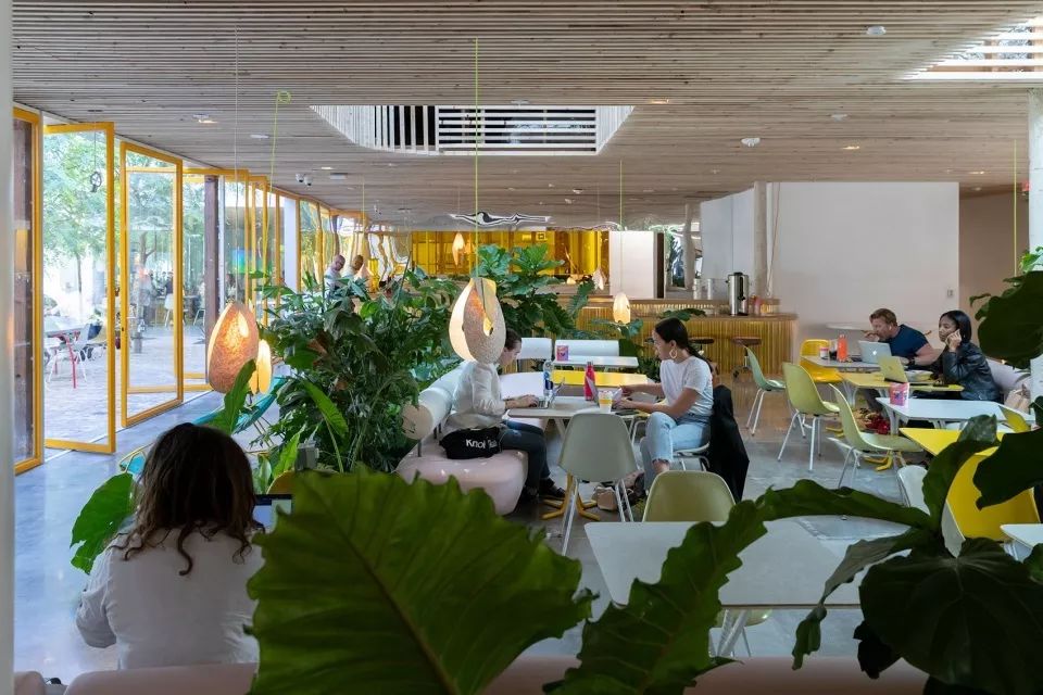 休闲区域也是特别的宽阔,分为室内跟室外公共休闲区。室外公共休闲区采用了围绕着树木形成的动线布局,几乎每一棵树下都会有桌子且与树木相连,就像树木衍生出的一部分一样,与自然是“共生体”。