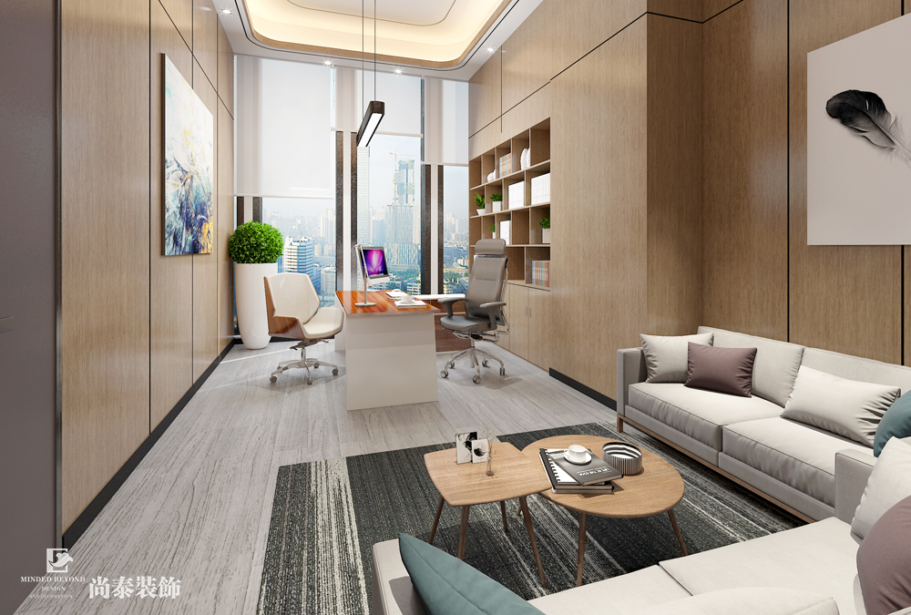 在整个设计定位中,整体风格走新中式风格,两间办公室打通合为一间办公室