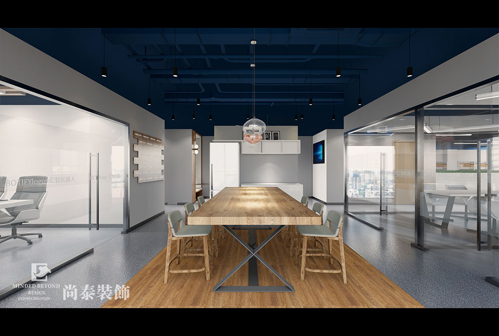 本案为机器人研发科技公司办公室装修设计,深圳装修公司尚泰装饰设计师采用工业风格,打造时尚简约的办公空间。