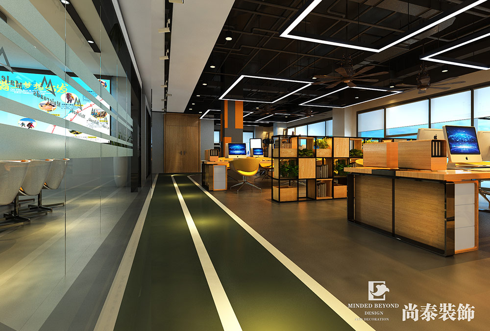 绿色的走道,木质办公家具,自然的水泥地面,随处可见的品牌“橙”。