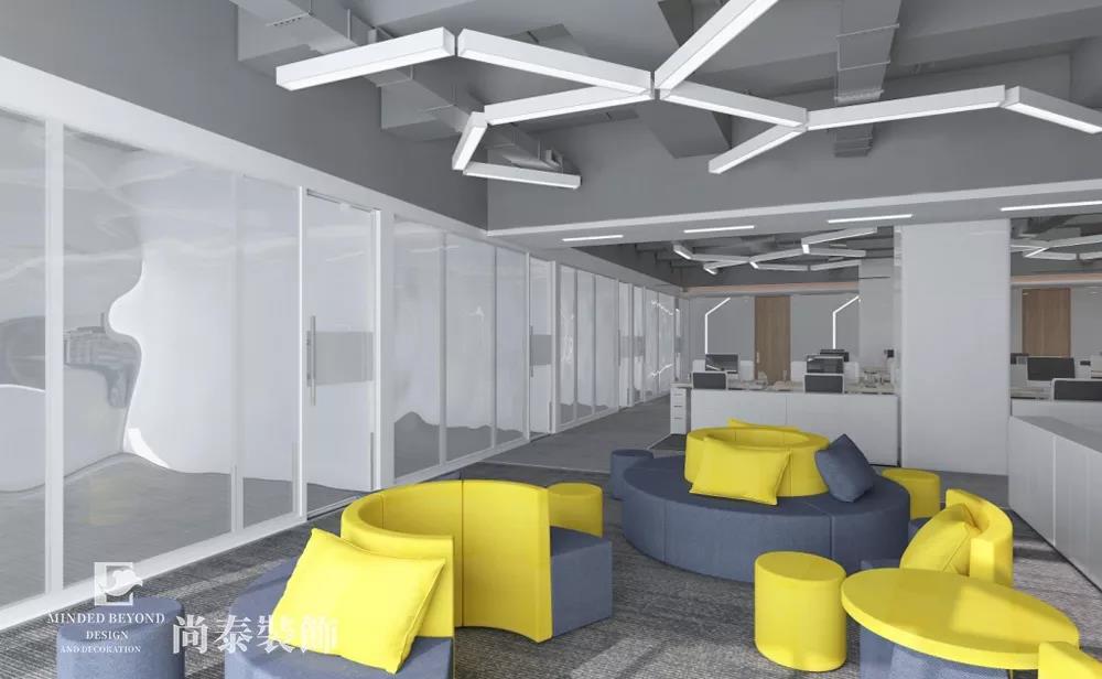 休息区采用了和办公区相同的天花板吊顶,半圆弧形沙发布置给空间视觉增添了活跃感,灰色底座和空间的灰白主色调相协调,同时采用明亮黄色作为空间点缀色,使得空间更为层次分明的同时,也增添了活泼感。