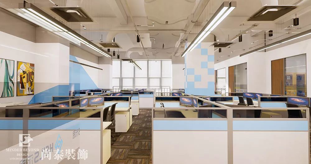 本案的办公空间在开放式办公和联合办公理念的趋势下,将独立办公和开放式办公相结合,还有具备私密性的静音洽谈室,形成开放中相对保守,联合中相对独立的特点。设计最大限度地引入自然光,人工照明相配合,妥善地处理空间内采光不足的弱点。办公区整体以白色调为主的空间,营造符合使用者简洁干练的工作环境,在墙面、家具等局部均使用纯色跳跃色块处理,给人干净明朗的感觉。空间内还结合了深色的木饰面和地板做搭配,既稳重又活泼!