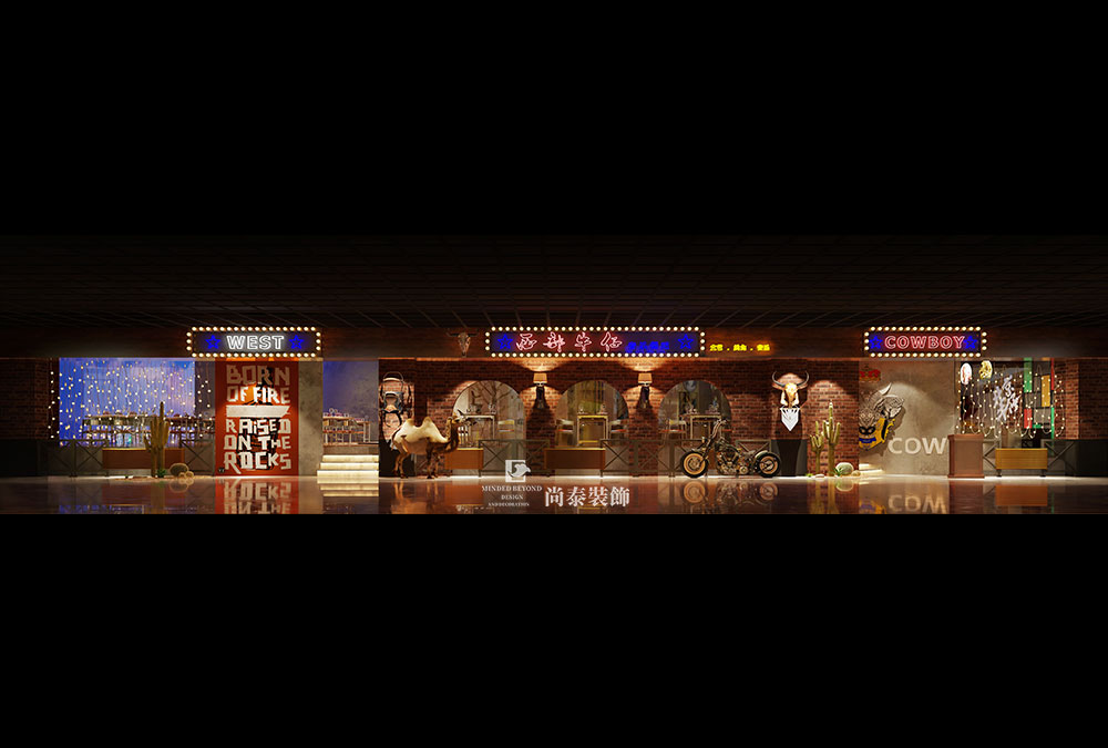 金骊城西部牛仔音乐主题餐吧致力于打造复古风格西部沙漠加“英雄主义”体验感,主营烤鱼、酒水,通过防腐木与仿古文化石的结合,大漠风情的场景化营造,搭配动感灯光环境,让用餐者体验一把与音乐美食互动的体验感空间。通过对大漠西部牛仔的致敬,对业主西部英雄情结的充分理解和探索,运用深沉的防腐木纹,配合故事性的灯光氛围,打造一个复古舒畅,感动人心的西部牛仔音乐餐吧。